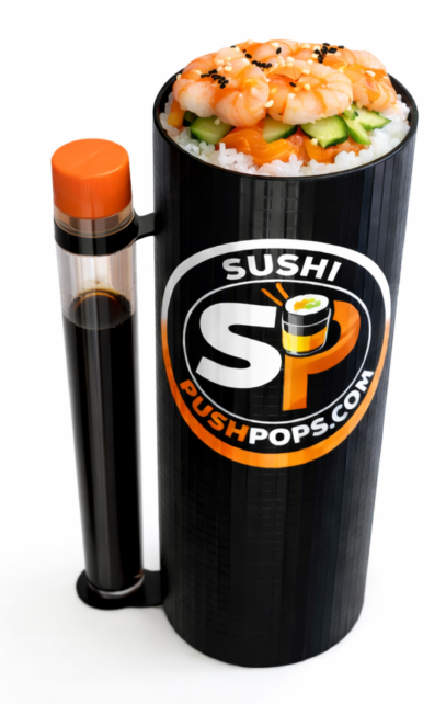 De pushpop-verpakking is een verticale verpakking die de sushirolletjes beschermt tegen platdrukken via de zijkanten. Ook zorgt de verpakking dat je de sushi netjes kunt eten en zorgt voor een echt “show”-element op het moment dat de sushi eruit gedrukt wordt.